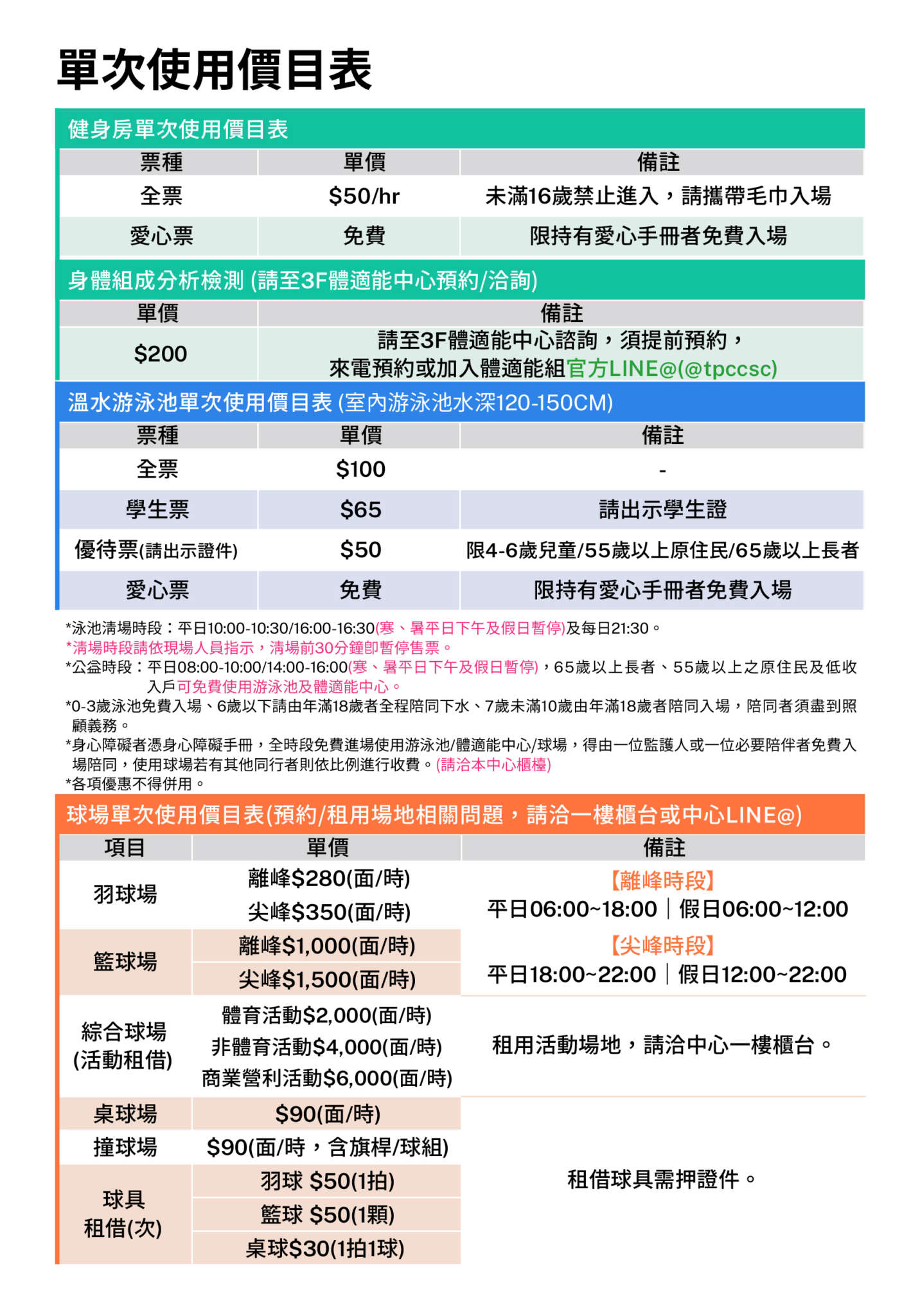 ◆場租活動:體育活動2,500元/時/6面;非體育活動4,000元/時;商業營利活動6,000元/時