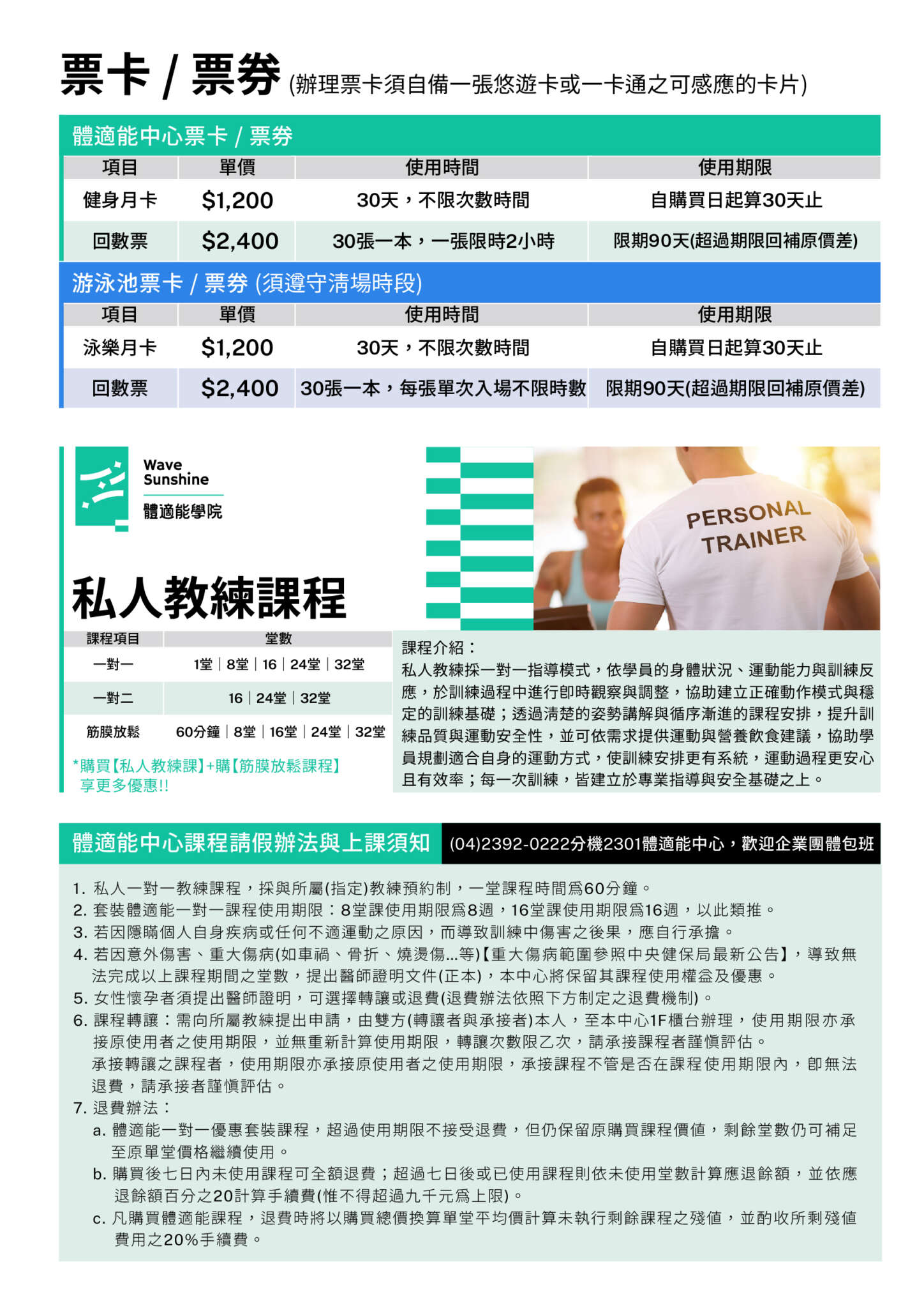 ◆身心障礙者憑身心障礙手冊,全時段免費進場體適能中心及游泳池(泳池清場時段除外);