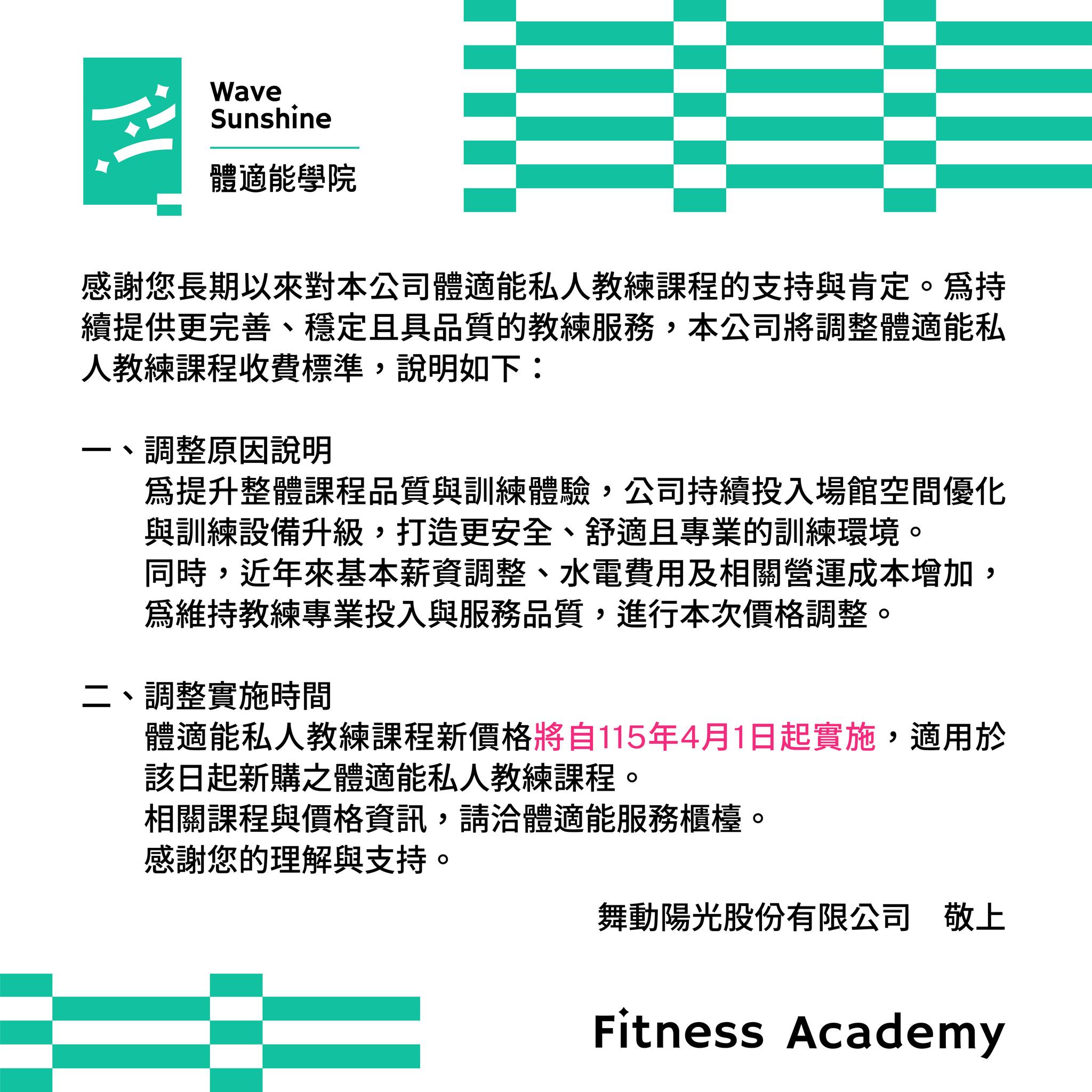 2026-02-24 wstpdmin in 訊息公告 瀏覽人數 561 【體適能私人教練課程費用調整說明】 親愛的學員您好 感謝您一直以來對本中心體適能私人教練課程的支持與信任 💛 為了持續提升課程品質、教練服務與更優質的運動空間,並因應近年營運成本增加,我們將調整體適能私人教練課程收費標準。 📌 新價格將自民國 115 年 4 月 1 日起實施 並適用於該日起新購之私人教練課程。 造成不便我們深感抱歉,也謝謝您的理解與支持。 我們會持續用更好的服務與品質回應您的信任 🙏