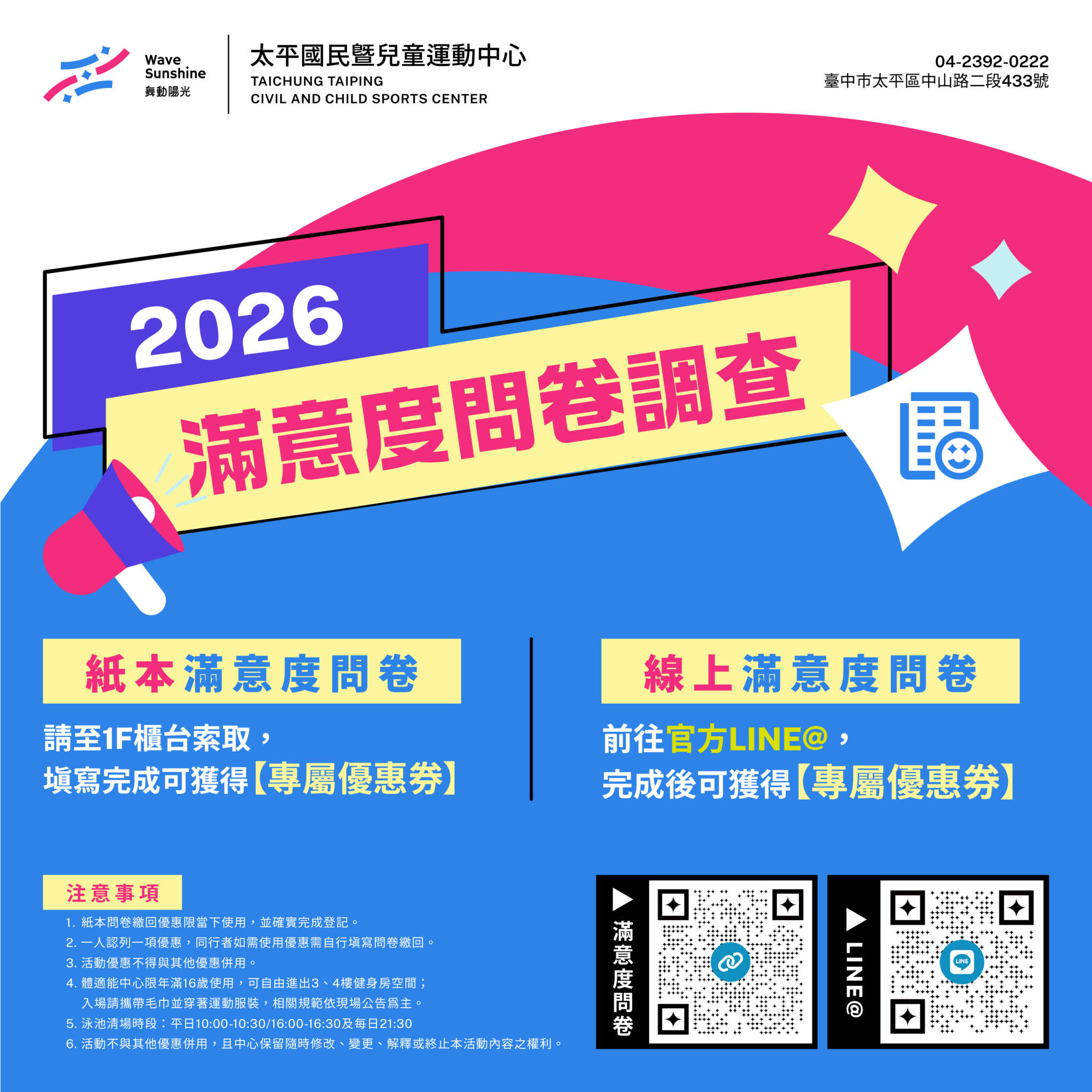 2026-04-14 wstpdmin in 最新活動 瀏覽人數 21 2026滿意度問卷來啦 填寫表單:https://forms.gle/NXtNHVGFCrikQqQ6A 每一份回饋,都是我們進步的方向 完成問卷即可獲得【專屬優惠券】 (入場享8折優惠) 紙本|1F櫃台索取;優惠券需當下使用 線上|表單填寫;優惠券需當月使用 一起讓太平國兒運越來越好 每人限領(使用)一次! Tapi編貼心說明:還是需要遵守入場規範唷。 ➙官網:tpccscwdyg.com.tw ➙LINE ID: @tpccsc ➙電話:04-2392-0222 ➙地址:臺中市太平區中山路二段433號