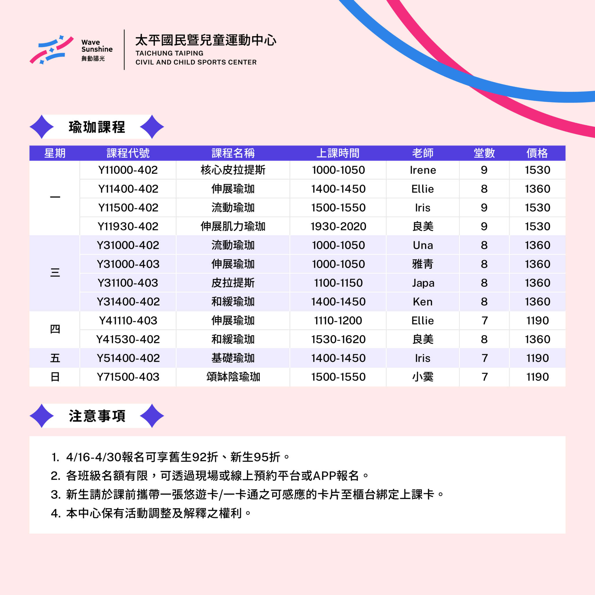 2026-04-27 wstpdmin in 最新活動 瀏覽人數 26 <<突破自我 活力全開>> 5–6月精選課程強勢登場! Join Now! 還沒報名的你,別再錯過,快來挑選心動課程! 4/30 前報名享限時優惠: – 舊生 92 折 – 新生 95 折 報名方式:線上 / 現場皆可 ➙官網:tpccscwdyg.com.tw ➙LINE ID: @tpccsc ➙電話:04-2392-0222 ➙地址:臺中市太平區中山路二段433號