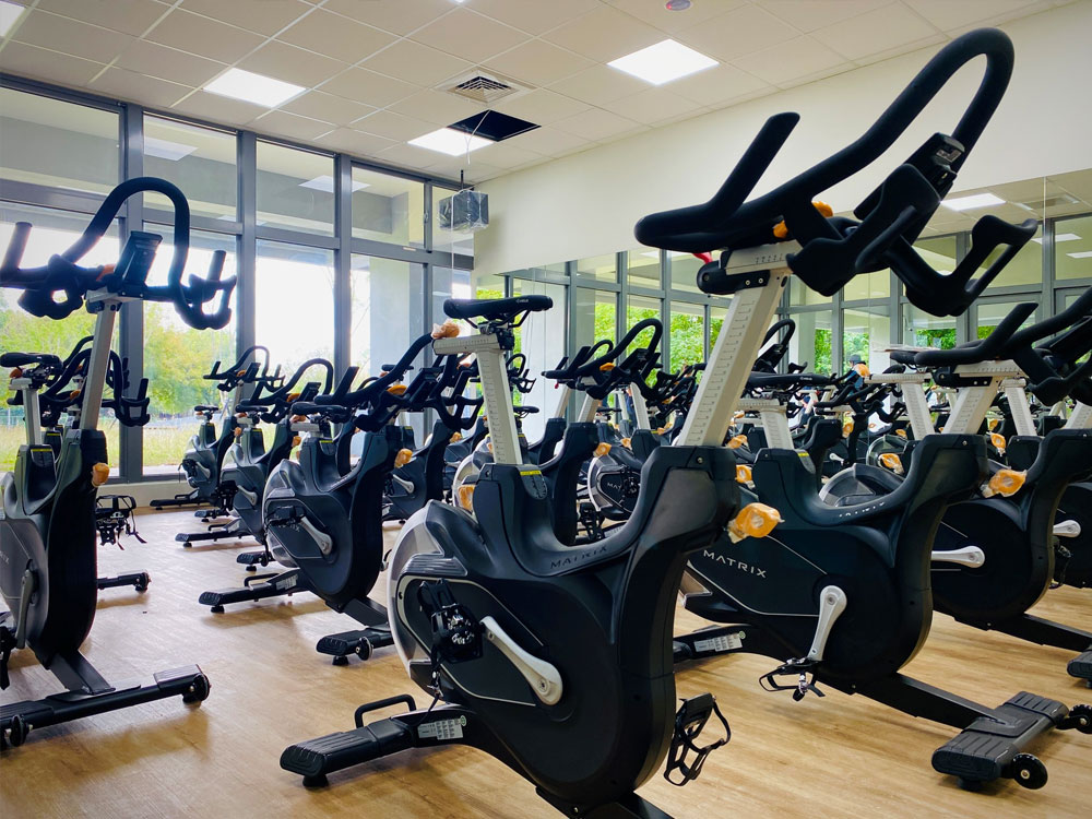 飛輪教室為高效心肺訓練空間,透過專業飛輪車、節奏音樂與教練指導,引導學員進行間歇、爬坡、衝刺等多元騎乘訓練。課程能有效提升心肺耐力、燃燒熱量、強化下肢肌群,同時在沉浸式燈光與音樂氛圍中體驗騎乘快感。